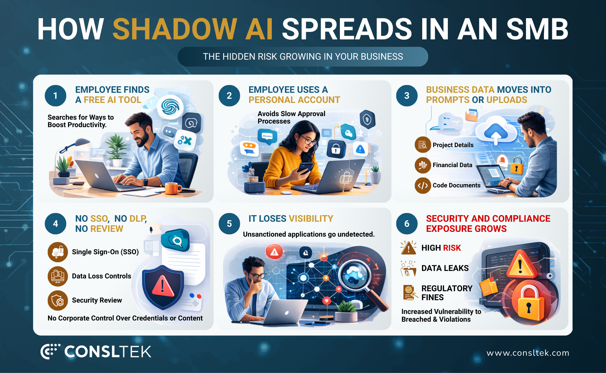 That is the real issue for a growing company. AI can save time, but it can also move business data into places IT never approved, monitored, or secured. A single upload can expose customer records. A copied prompt can reveal pricing strategy. One browser extension can open a new path into company data. These are not edge cases. They are normal business actions done in the wrong environment.